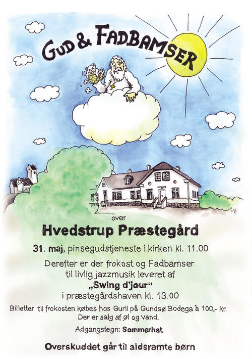 Det er så hurtigt blevet til, at vi starter med pinsegudstjeneste i Hvedstrup kirke kl. 11.00, hvorefter hat og plads indtages i præstegårdshaven. Der arbejdes på forskellige indsamlingstiltag til fordel for Danmissions ”Aidsramte børn i Afrika”, ligesom de fadbamser, der vil blive solgt, vil indbringe et beløb til indsamlingsprojektet.