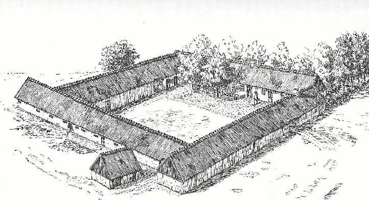 Rekonstruktion af "Vejlegaard", udført af Peter Holm efter Ole Pedersens Anvisning. Ved udskiftningen 1805 blev den flyttet ud på marken og fik navnet Vejlegård, vel nok fordi den ligger i en lavning, en såkaldt Vejle.
